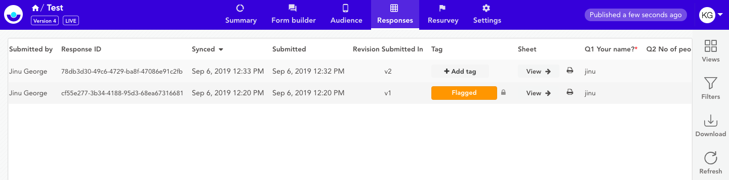 If you want to view some specific responses, click on the "Filters" button on the right of the screen where you can filter data by a specific synced date range, user, response tag, or response ID. Click on “Refresh” to update your responses after adding a filter.